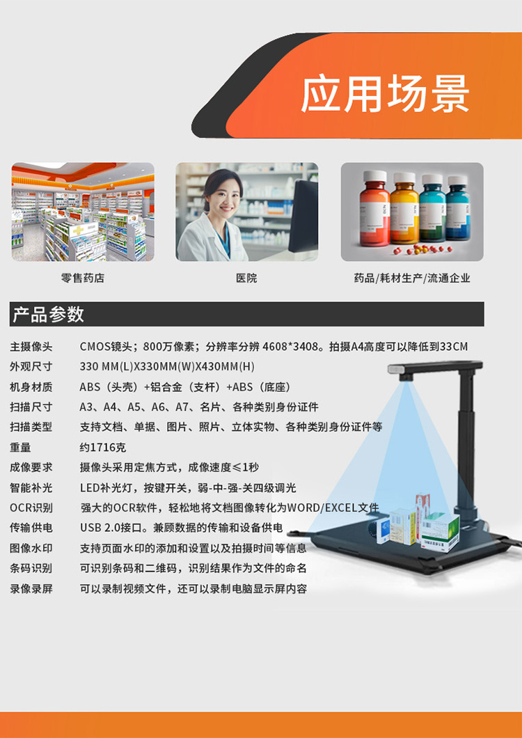 (*由于產(chǎn)品升級或其他原因,藥品溯源碼高拍儀產(chǎn)品實際參數(shù)有可能變更,以實際產(chǎn)品為準(zhǔn)。本文中的所有陳述、信息和建議也不構(gòu)成任何明示或暗示的擔(dān)保)